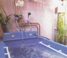 I et stort blåt badekar med 700 liter saltet, let parfumeret vand, der ligner noget fra Tintin, med støttegreb, trykmålere, termometer, slanger og rør og en nakkestøtte i læder.